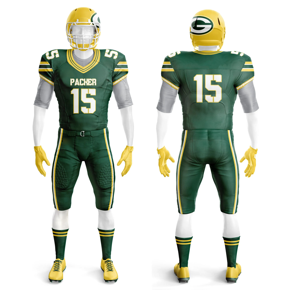 "Custom green and gold American football uniform with number 15 and yellow helmet – front and back view" "NFL-style football jersey and pants set with integrated pads, gloves, and helmet – designed for export" "Green Bay Packers-inspired American football uniform displayed on mannequin, made in Pakistan" "Full American football gear set in green and yellow colors, including jersey, pants, and helmet"
