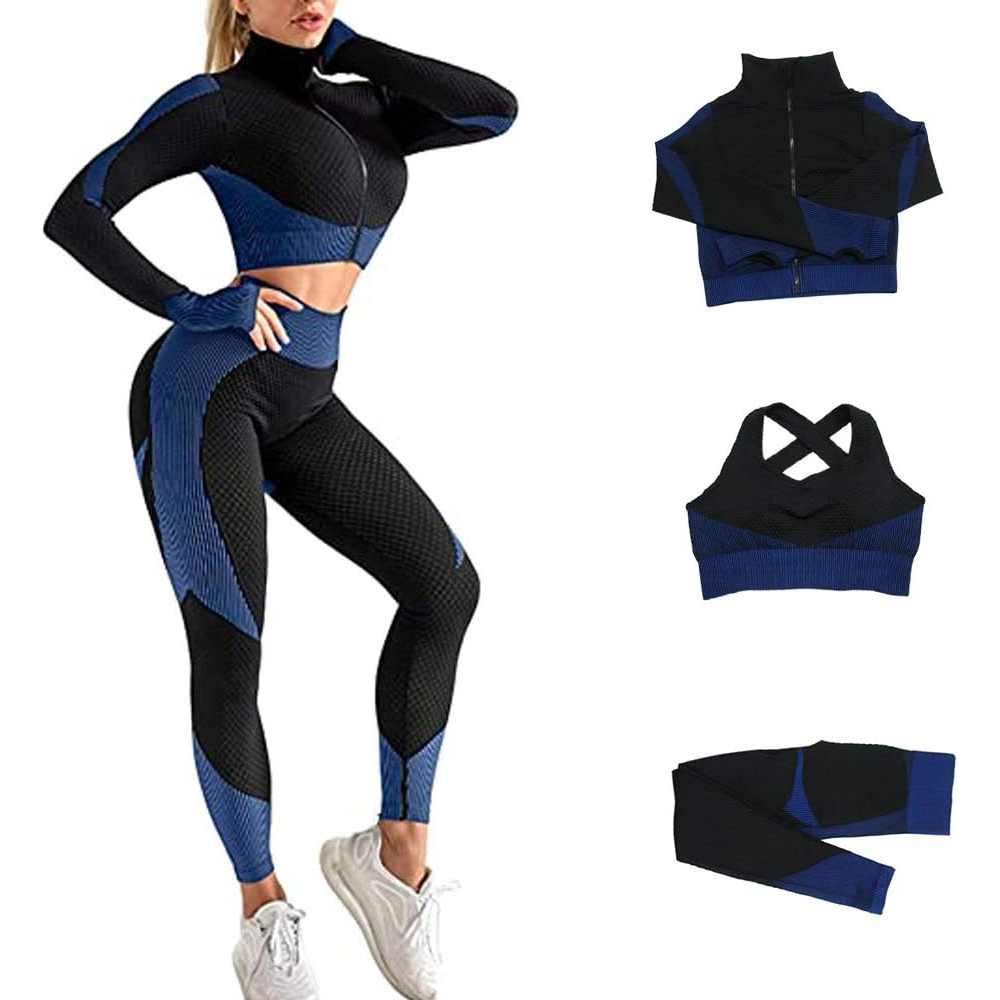 Women’s Seamless 3-Piece Fitness Set – Navy Blue and Black